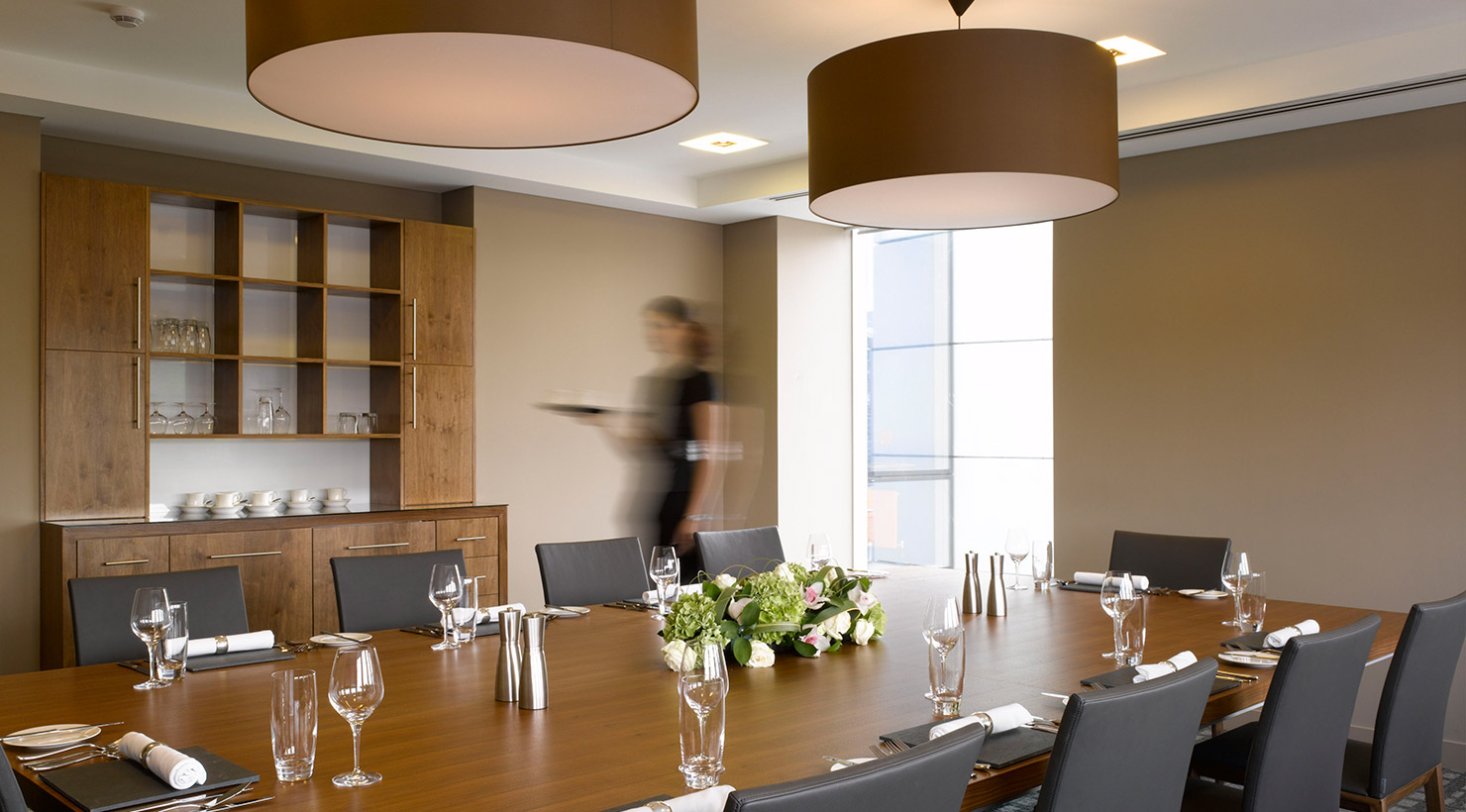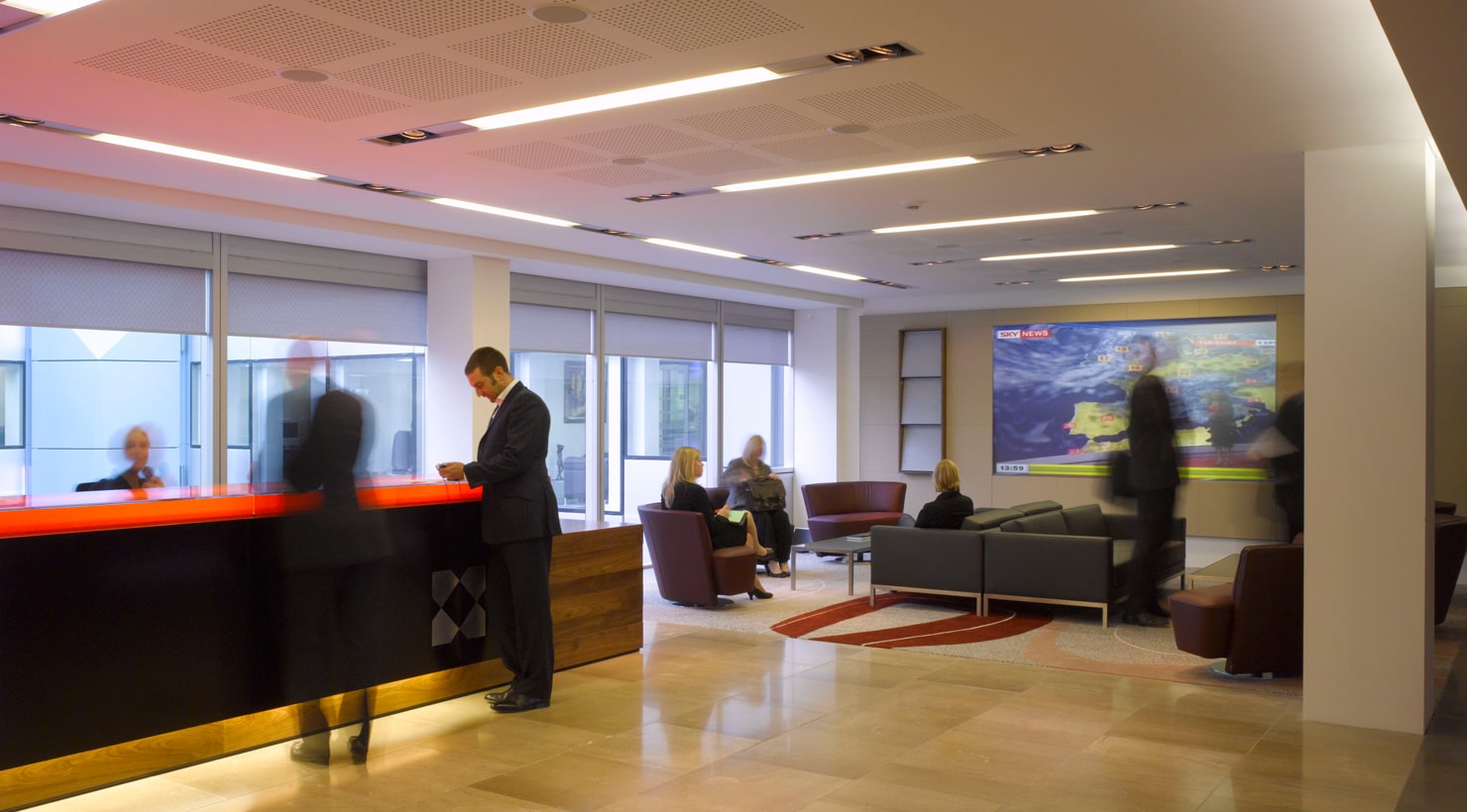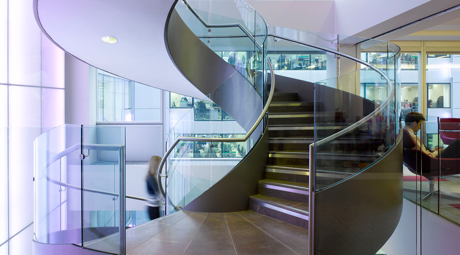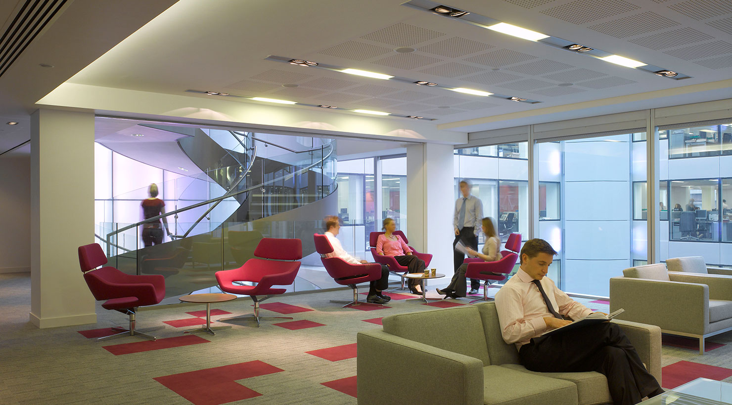A new feature helical stair responds to the client’s desire to achieve a clear sense of unity and ‘easy collaborative interaction and communications across all staff divisions’, despite the split between floors. The new stair connects the formal main reception area, with its bespoke reception desk, stone flooring and leather wall panelling, down to ‘The Core’, an expansive break-out area with large audio-visual displays where clients and staff can interact.